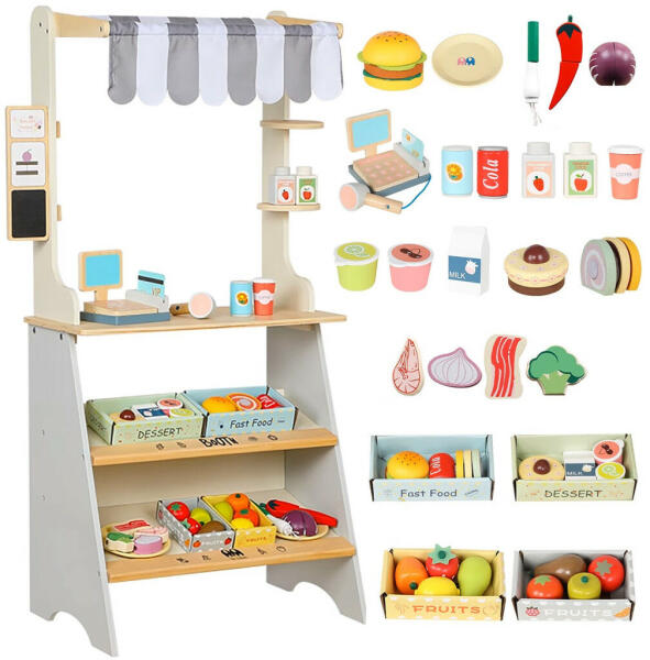 Játék Fa Zöldséges Pult Szupermarket Kiegészítőkkel - Kreatív Szerepjáték ?? Ez a fából készült zöldséges pult tökéletes hely a kis boltosoknak és vásárlóknak! A szupermarket játék lehetővé teszi a gyerekek számára, hogy kreatív szerepjátékokat játszanak, miközben fejlesztik szociális készségeiket és képzelőerejüket. A készlet rengeteg kiegészítőt tartalmaz, így a játék még valóságosabb és szórakoztatóbb. Főbb Jellemzők:Masszív fa konstrukció: Tartós és biztonságos játék. Élénk színek: Vonzó megjelenés, ami felkelti a gyerekek figyelmét. Szövet napellenző: Valósághű bolt hangulat. A Készlet Tartalma: Fa állvány Fa pénztárgép leolvasóval és bankkártyával ? Kartondobozok zöldségeknek és gyümölcsökkel ?? Kartondobozok hamburgerekhez, kólához, tejtermékekhez ?? Két tányér ?️ Sütemények ? Kávé ☕ Italok, gyümölcslevek ? Egyes zöldségek és sütemények tépőzárral rögzíthetők. Méretek: Állvány méretei: 95,5 x 29,5 x 45 cm Fejlesztő Játék: Ez a zöldséges pult nem csak szórakoztató, hanem fejleszti a gyerekek képzelőerejét, kreativitását és szociális készségeit. A szerepjátékok során megtanulják a vásárlás és eladás alapjait, miközben szórakoznak. A sokféle kiegészítő lehetővé teszi a változatos játékot, így a gyerekek sosem fognak unatkozni. Összeszerelést igényel: A termék összeszerelést igényel, de a lépésről lépésre képes utasítások segítségével könnyen összeállítható.