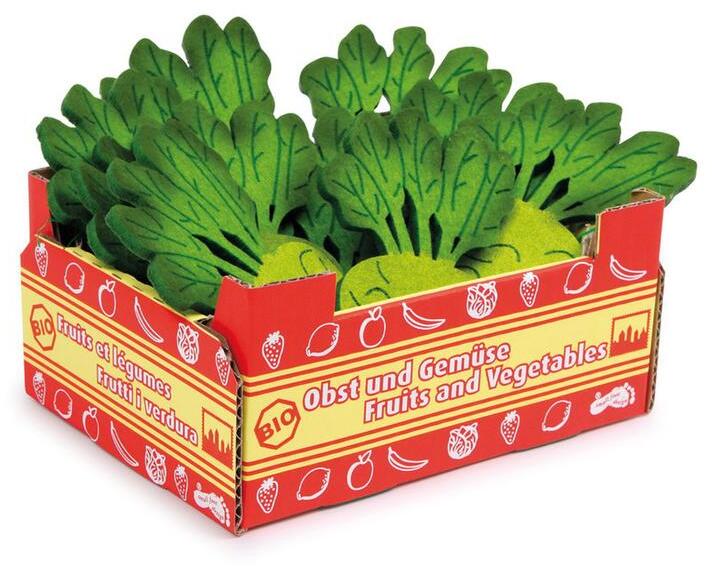 Zöld, filc szövet játék karalábé  készlet zöldséges ládában. A láda szalmával bélelt és 12 darab karalábét tartalmaz.   Nagyszerű változatosság a játékkonyhai kiegészítők és játékboltok számára ez a harsány zöld, friss karalábé!  Finom ételek készíthetők a filc karalábéval.   A játékboltok csodálatos újdonsága a textil zöldség karalábé és a hozzátartozó karton tároló doboz.     Minden óvodai csoportban, játszóházban és otthoni babaszobában elengedhetetlenek az egészséges gyümölcsök és zöldségek.