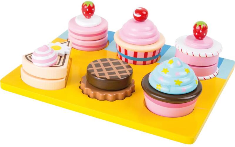 6 darab színes díszíthető és szeletelhető muffin és sütemény szelet fából formavágott tálcával. Minden sütemény a saját helyére illeszthető. A sütemény szeletek tépőzárral tapadnak össze.   Boltos, konyhás, éttermes, pékséges, vendégséges, látogatós és zsúros játékok értékes kiegészítője a szeletelhető muffinok.