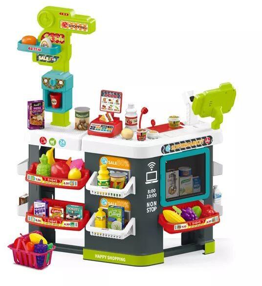 Kér még valamint?A gyerekek megnyithatják saját kisboltjukat, és termékekkel kereskedhetnek - mindeközben a pénztárgép játékosan tanítja őket számolni. A kis eladók és vásárlók elképzelhetik, hogy egy igazi boltban vannak. A szett számos kiegészítőt tartalmaz mint gyümölcsök, zöldségek, tej, olaj, tojás, és meg sok minden más. A gyerekek játék közben megismerkedhetnek a számolás és fizetés alapjaival is, mikor fizetnek a játékpénzzel vagy bankkártyával. A készlet lehetőséget teremt a szerepjátékra, ami fejleszti a gyerekek képzeletét, fantáziáját és kreativitását, emellett hozzájárul a térlátás, és a finommotorika fejlődéséhez is. A termék jellemzői:- Fejleszti a képzeletet, fantáziát és kreativitást- Hozzájárul a finommotorika fejlődéséhez- Színes, vonzó dizájn- Tartós anyagból készültA termék összeszerelt mérete: 69 x 38 x 87 cmCsomagolás mérete: 46 x 60 x 16 cm